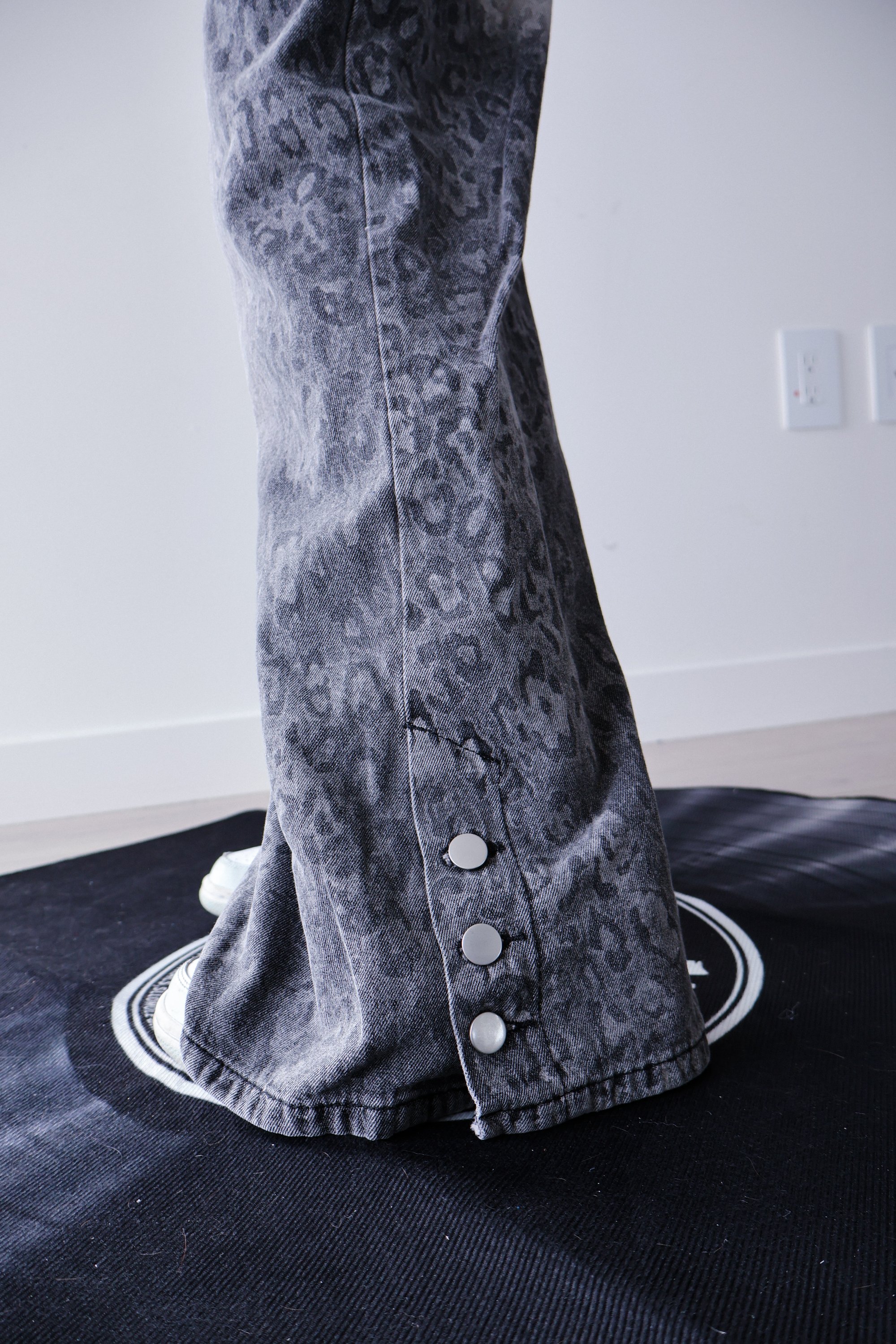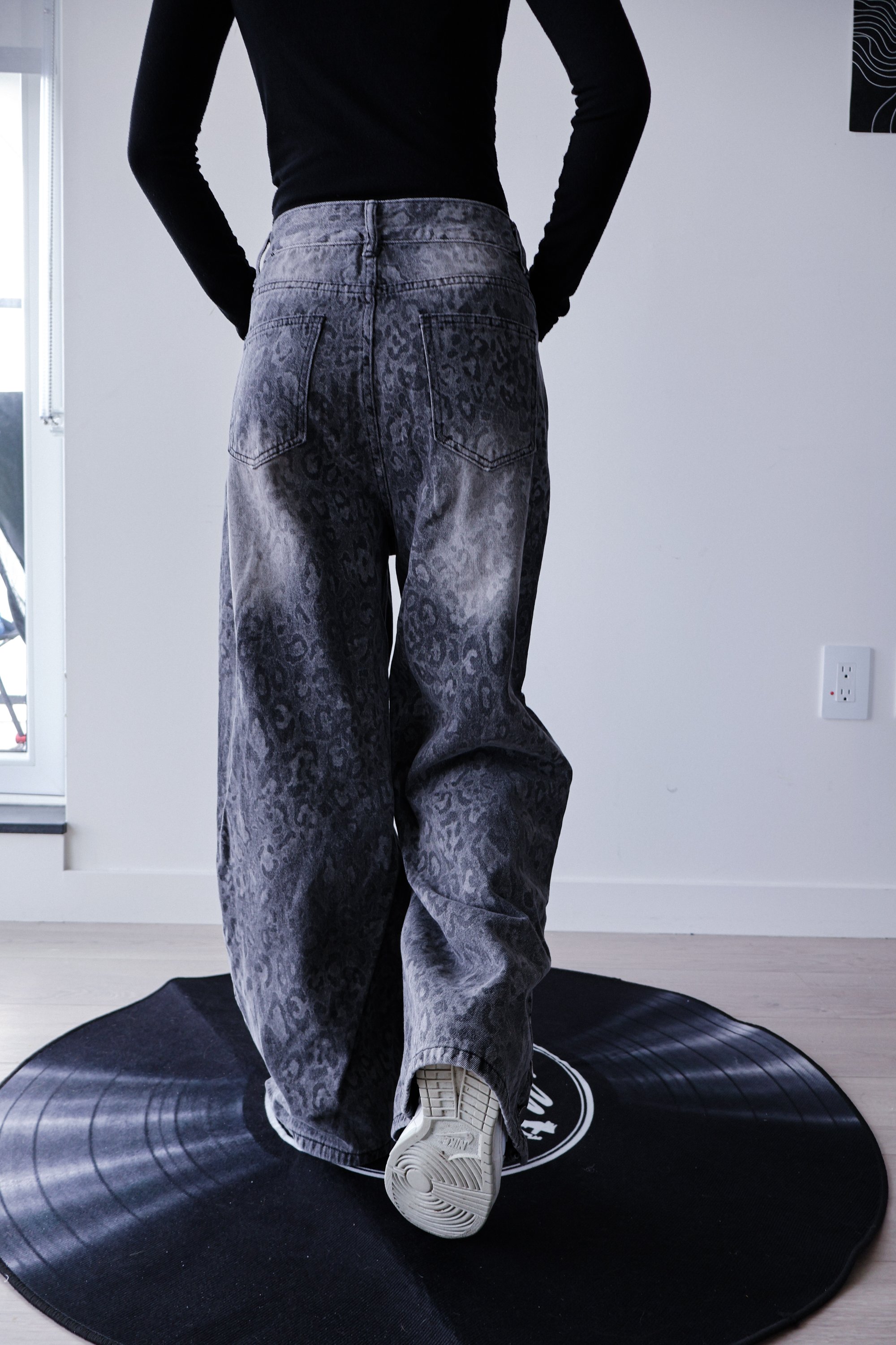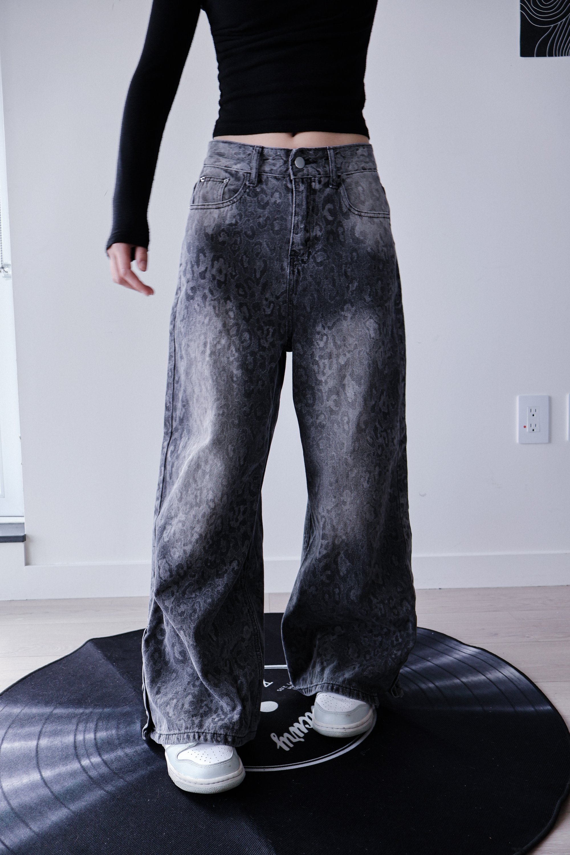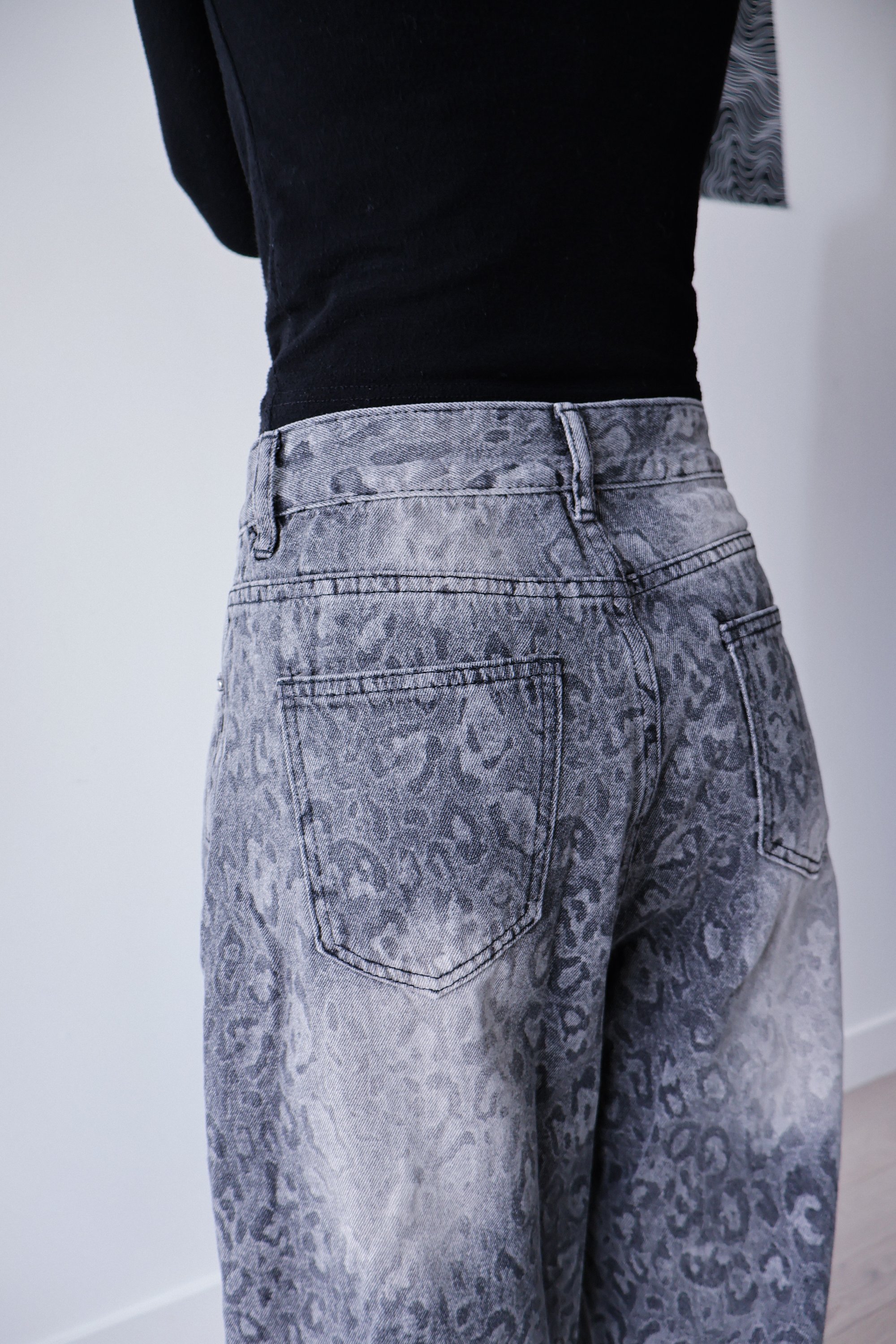 Washed grey denim with a subtle leopard pattern for an edgy, worn-in look. Designed in a relaxed wide-leg fit for an effortless streetwear silhouette.
