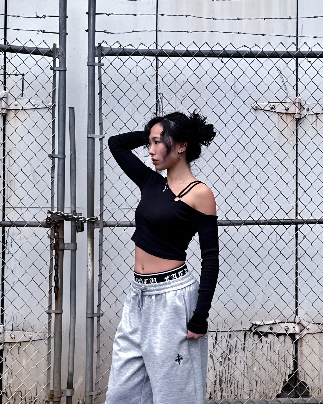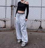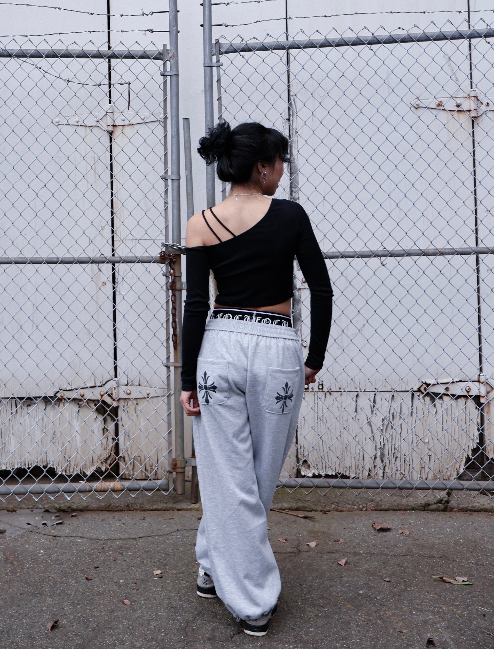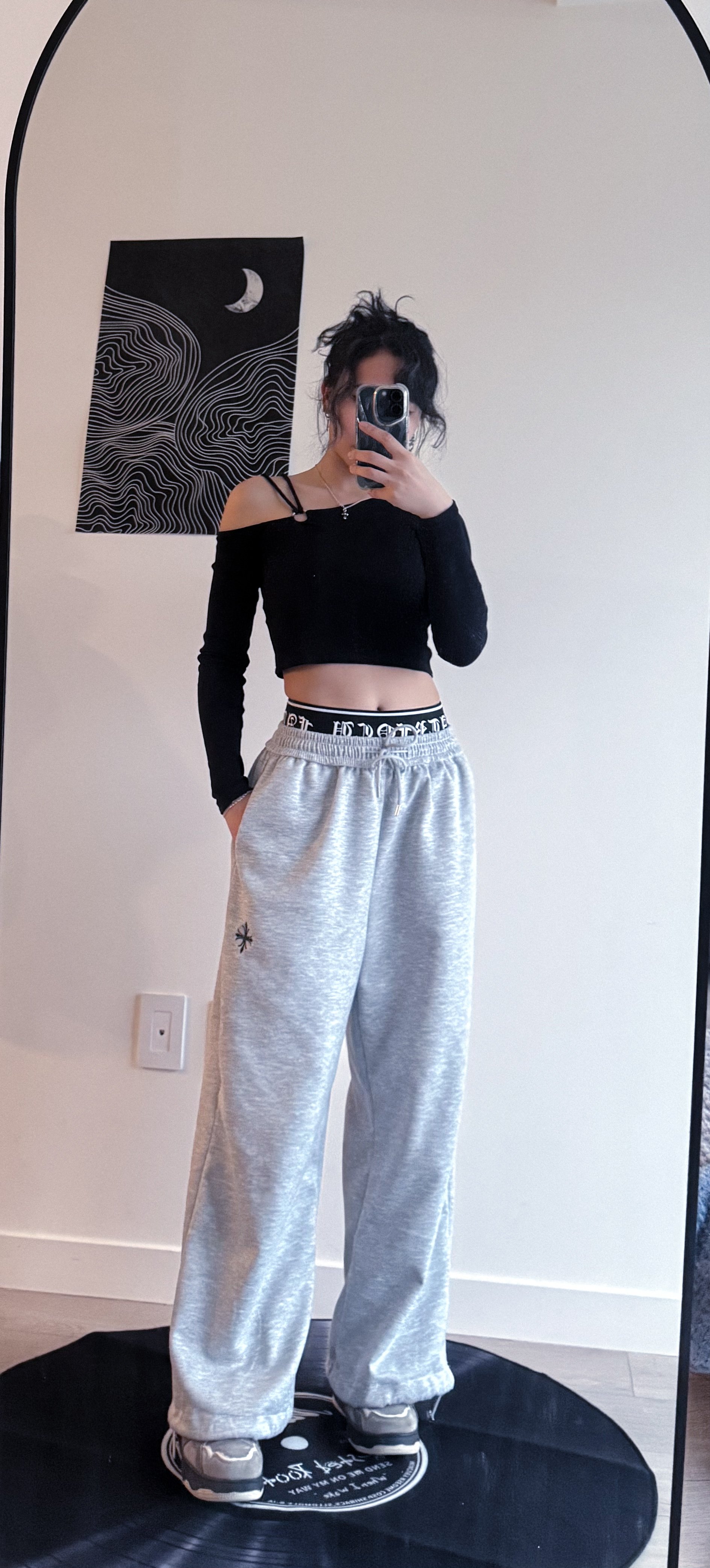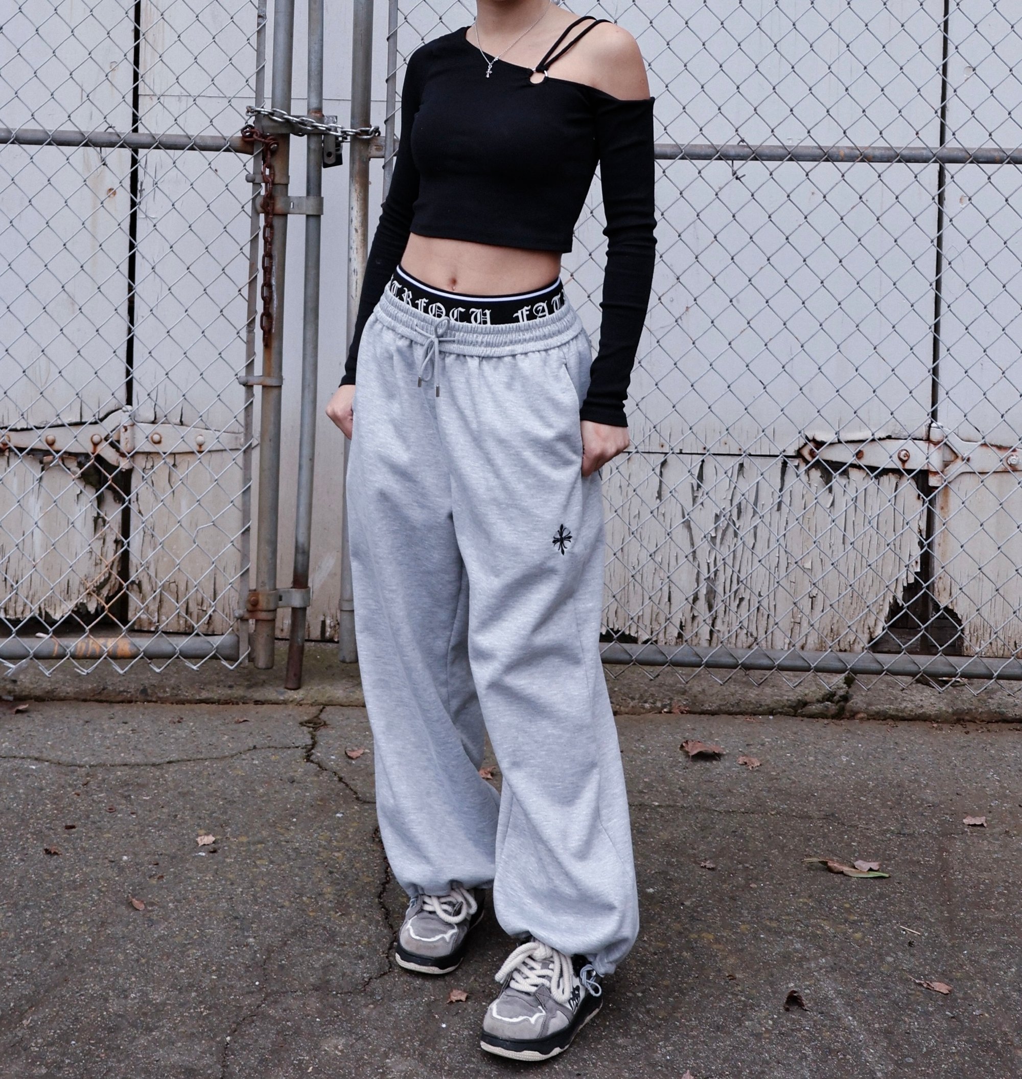 Comfortable relaxed wide-leg sweatpants with a built-in black layered waistband for a subtle streetwear edge. The perfect dance pants!